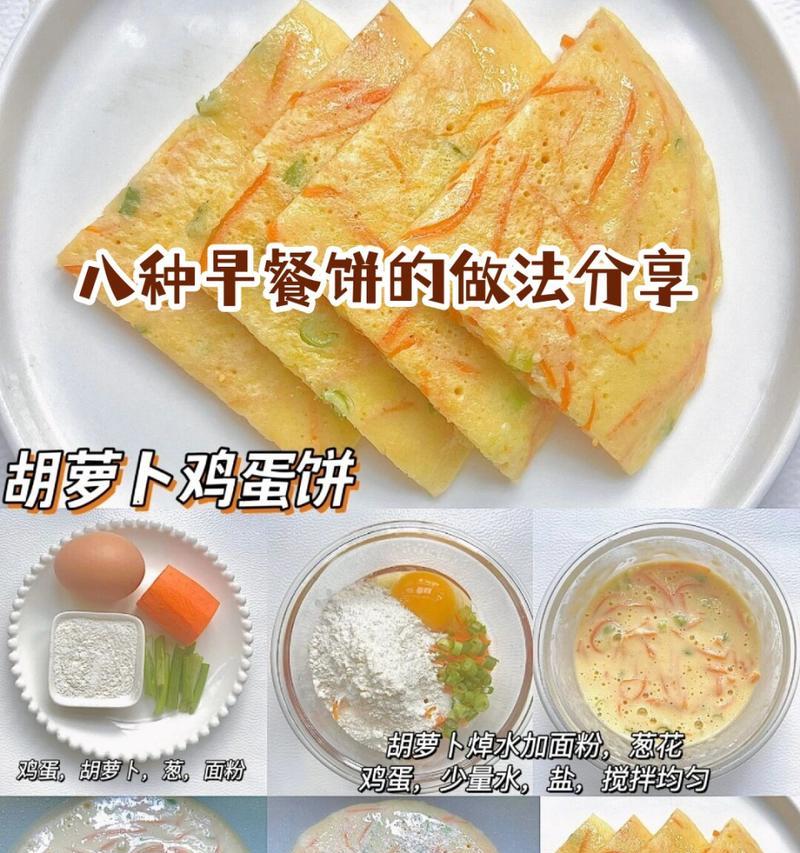 1.菠菜汁胡萝卜鸡蛋饼口感细腻、营养丰富,是早餐中的不错选择;