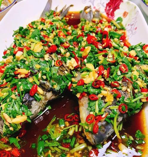 将鱼头翻面,再次浇上青红椒酱汁,焖煮5分钟,使鱼头吸收汤汁和青红椒的香气。