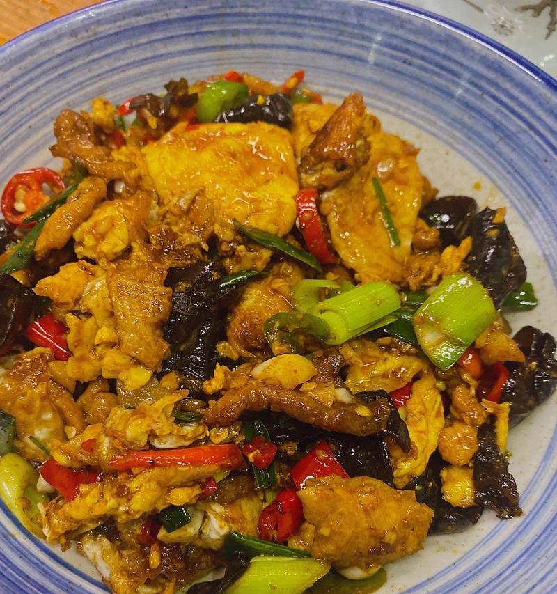将炒好的青红椒丝倒入锅中,和酱汁一起拌匀。