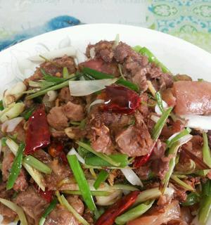 将泡椒和葱姜等调料加入驴肉中进行炒制,做成口感酸辣适口的泡椒炒驴肉。