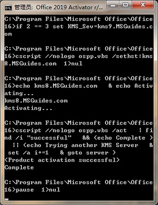 (if exist “%ProgramFiles%\Microsoft Office\Office16\ospp.vbs” cd /d “%ProgramFiles%\Microsoft Office\Office16”)&(if exist “%ProgramFiles(x86)%\Microsoft Office\Office16\ospp.vbs” cd /d “%ProgramFiles(x86)%\Microsoft Office\Office16”)&(for /f %%x in (‘dir /b 。。\root\Licenses16\ProPlus2019VL*.xrm-ms’) do cscript ospp.vbs /inslic:“。。\root\Licenses16\%%x” 》nul)&(for /f %%x in (‘dir /b 。。\root\Licenses16\ProPlus2019VL*.xrm-ms’) do cscript ospp.vbs /inslic:“。。\root\Licenses16\%%x” 》nul)